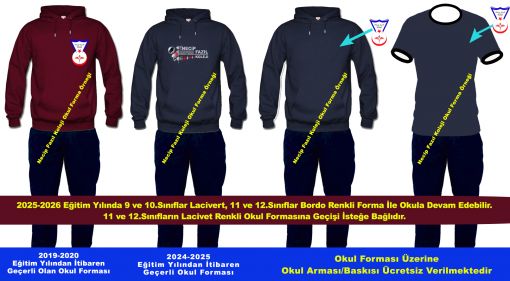 2024-2025 Eğitm ve Öğretim Yılı İtabarıyla (Lacivert Renkli) Okul Forması Örneğidir. 11 ve 12.Sınıf Öğrencileri Kullanmaya Devam Ettikleri Bordo Renkli Formayla Okula devam Edebilir. 11 ve 12. Sınıf Öğrencisi Lacivert Renkli Formaya Geçiş Yapması İsteğe Bağlıdır.